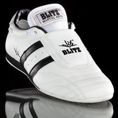 A multi-function soft leather shoe. Designed for martial arts use yet can be worn for leisure. The soft leather upper has additional stitching with contrasting stripes. The combination of the thin wedged shaped sole makes the shoe comfortable to wear whilst the circular pivot on the ball of the foot allows for kicking and spinning techniques.